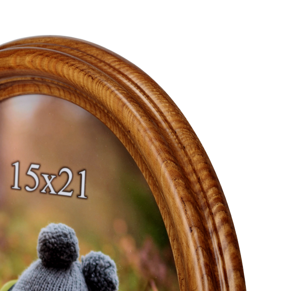 Klasyczna drewniana ramka owalna w formacie 15x21 cm to elegancki sposób na wyeksponowanie ulubionego zdjęcia. Jej naturalne, ciepłe wykończenie podkreśla charakter fotografii i dodaje wnętrzu przytulnego, tradycyjnego uroku.